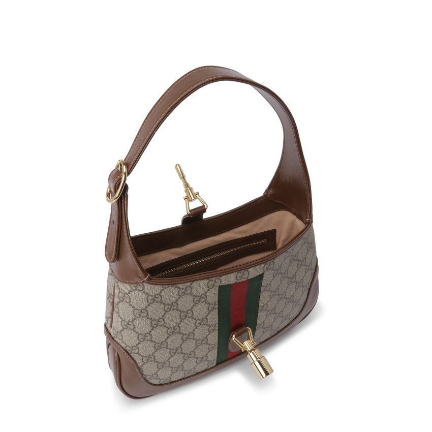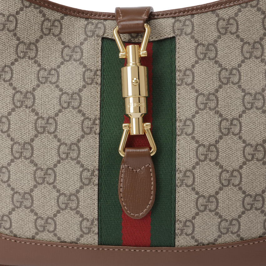 Revamping the icon, the Jackie 1961 small hobo bag by Gucci is presented in GG Supreme canvas with brown leather trim and green and red Web stripe. It features a microfibre lining, an open pocket and zipper pocket on the interior, a piston strap fastening, and a detachable strap.